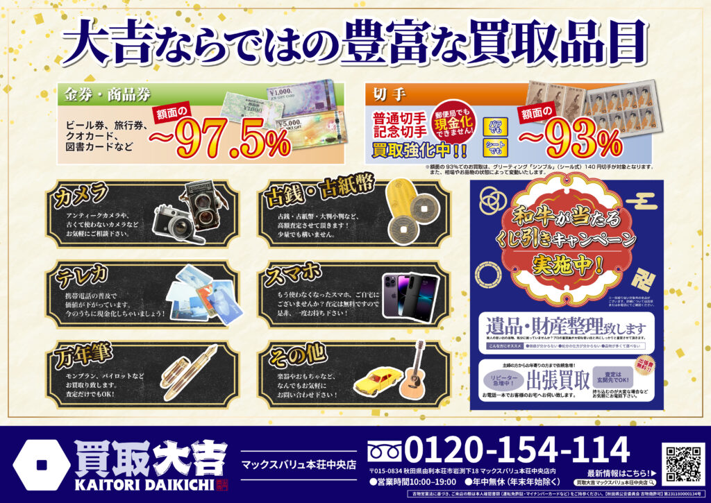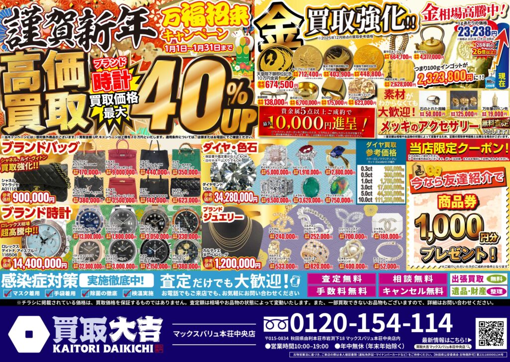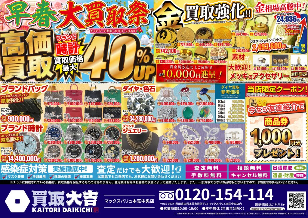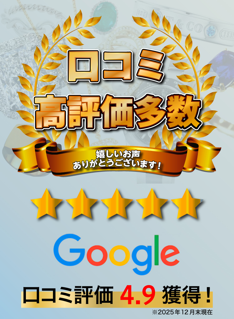 キャンペーン実施店舗 よくあるご質問 買取価格は主にどんな要素から決まるのでしょうか? お品物の状態や付属品の有無、最新相場、流通量などによって買取価格を算出します。 どんなものを買い取ってもらえますか? 金・貴金属・ブランド品はもちろん、お値段がつくか迷われているものも是非お持ちください。 傷や汚れのあるアイテムでも買取可能ですか? 大歓迎です。未使用品などのお持ち込みは少なく、傷や汚れのあるアイテムをお持ちいただく方が半数以上です。状態の悪いお品物やカビなどがあってもお買取可能なケースもございます。 どんな情報があればすぐに査定額を教えてもらえますか? お品物の名前や種類、状態、またはブランド名、型番などの情報があると、概ねの査定額をお伝えできるかと思います。 店舗での査定時間はどのくらいですか? お品物の種類や個数にもよりますが、約5分から30分ほどの査定時間となるケースが多いです。事前にある程度の査定時間をお伝えいたしますので、ご安心ください。